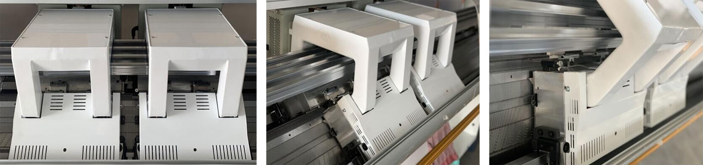 Dispositivo speciale: questa serie di prodotti adotta un doppio sistema con due carrelli, che può far funzionare due carrelli in uno. Può anche lavorare a maglia con ogni carrozza indipendentemente.